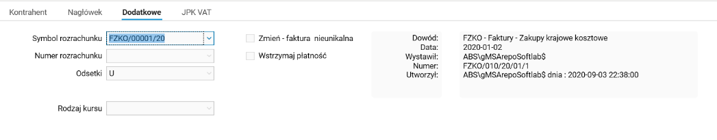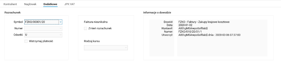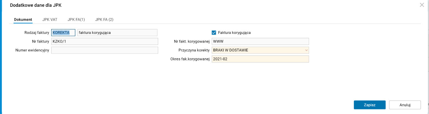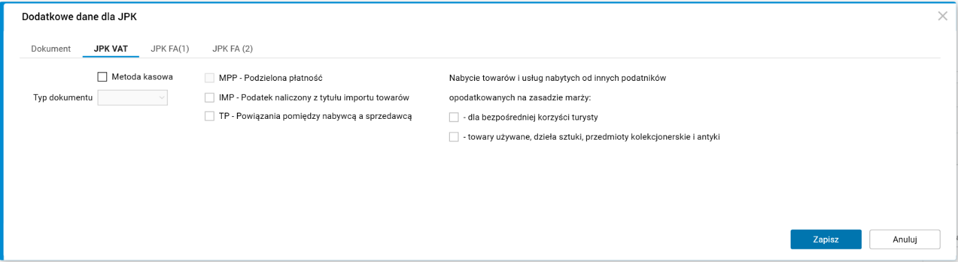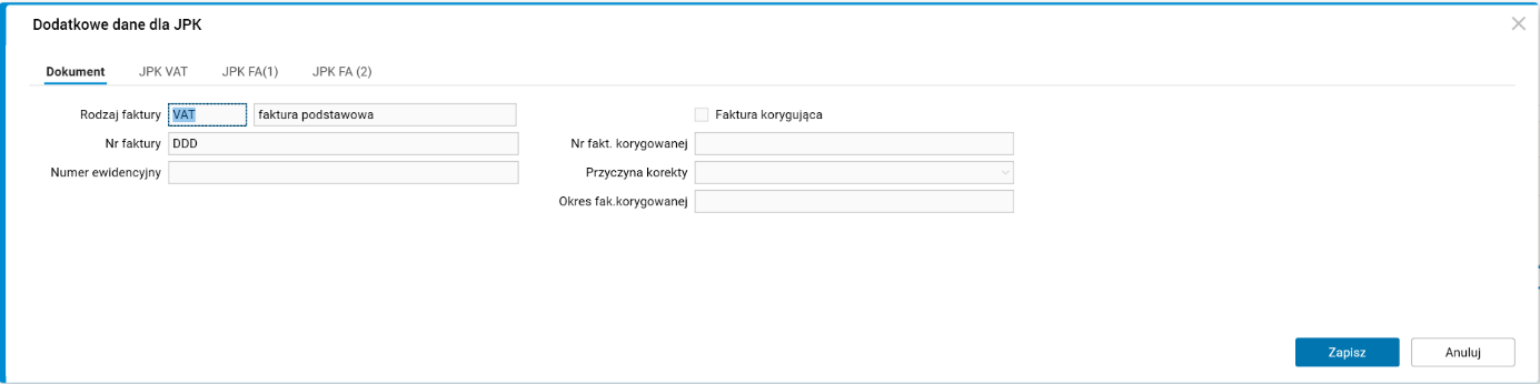 Rys. Dane dodatkowe dla JPK – zakładka Dokument