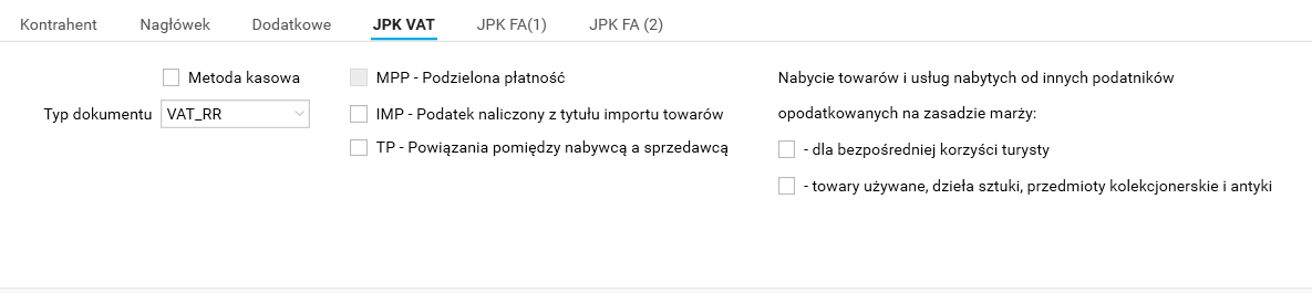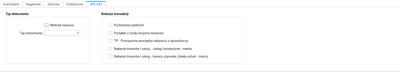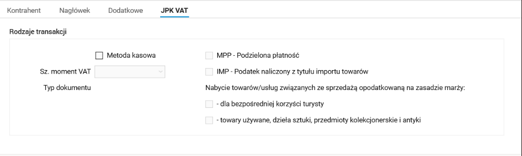 ·        JPK VAT – tu umieszczono dane związane z JPK VAT, czyli typ dokumentu i kody transakcji.
