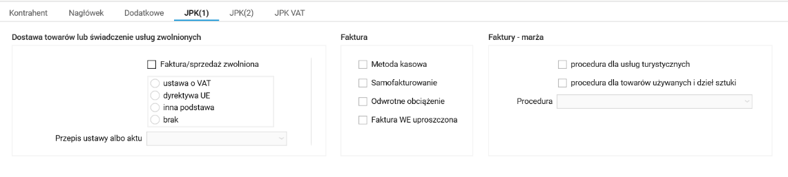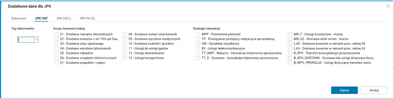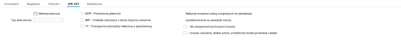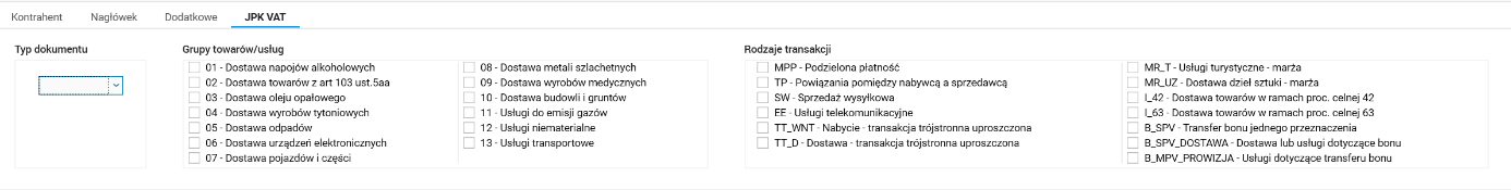 ·        JPK VAT tu umieszczono dane związane z JPK VAT, czyli typ dokumentu, oznaczenia GTU i kodów transakcji.