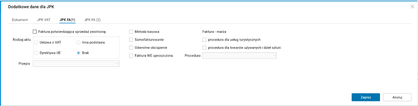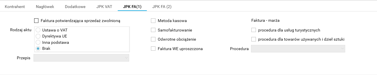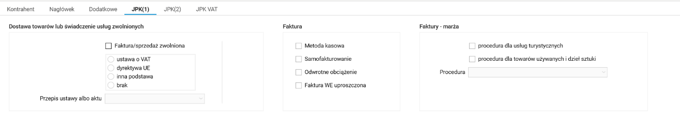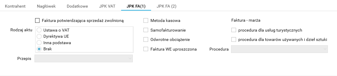 ·        JPK FA (1) – zakładka zawiera informacje wykazywane w pliku JPK FA – część 1.
