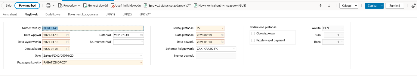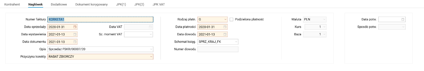 ·        Dokument – tu znajdują się podstawowe informacje o dokumencie: rodzaj faktury (oznaczenie na potrzeby JPK FA), numer faktury, numer ewidencyjny dokumentu oraz informacje o korekcie (nr faktury korygowanej, przyczyna korekty, okres faktury korygowanej).