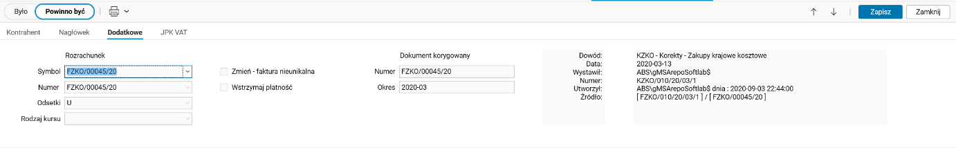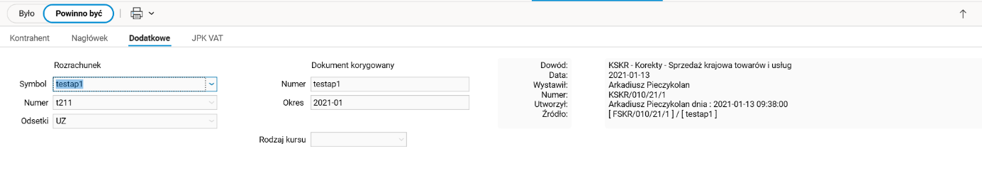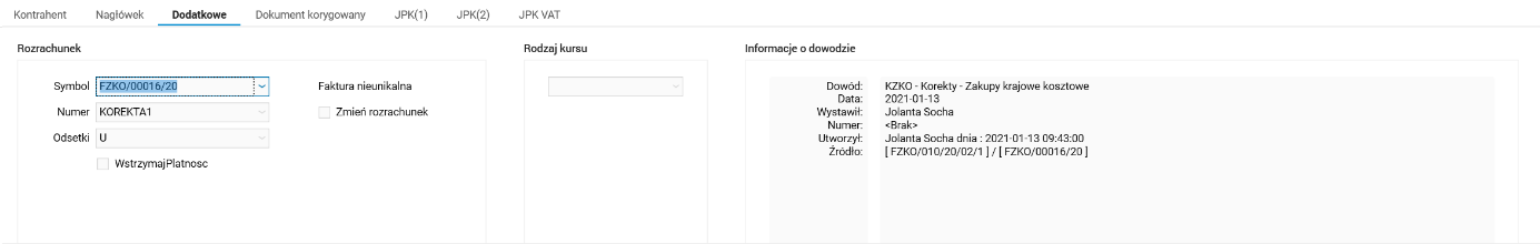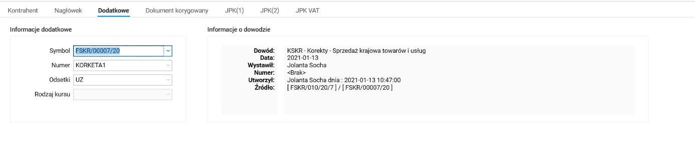 Informacje o dokumencie korygowanym były dotychczas w oddzielnej zakładce Dokument korygowany. Obecnie znajdują się w zakładce Dodatkowe, a zakładka Dokument korygowany została usunięta.