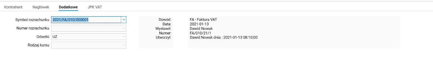 ·        Dodatkowe – tu umieszczono informacje opisowe o dokumencie, a także symbol i numer rozrachunku oraz sposób naliczania odsetek i rodzaj kursu. Zmiany w tej zakładce są niewielkie, dotyczą kolejności pól.