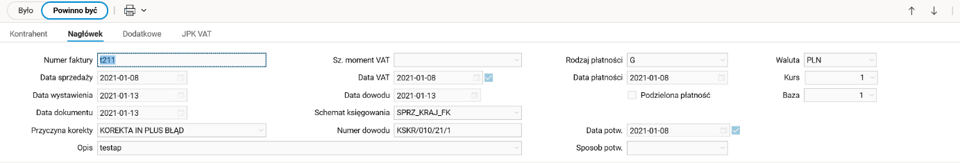 Edycja nagłówka w rejestrze sprzedaży – korekty