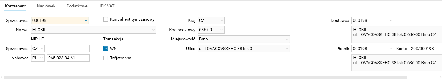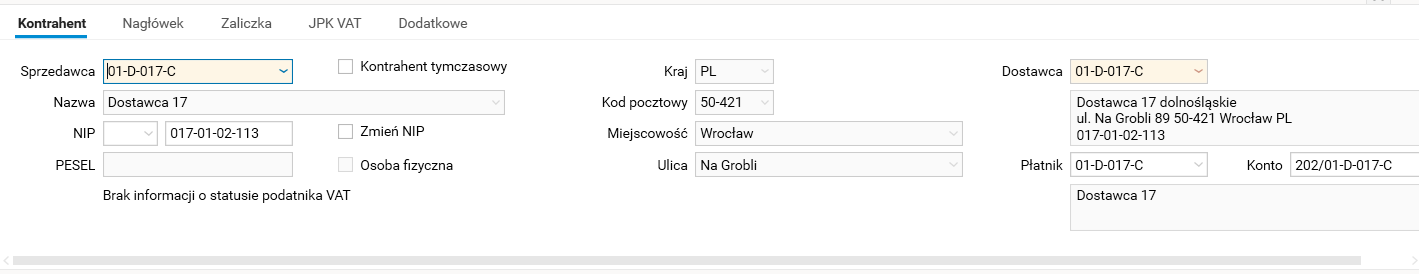 ·        Kontrahent – w zakładce dostępne są dane związane z kontrahentem, czyli logo, nazwa, NIP, adres nabywcy, logo dostawcy i jego dane, logo i konto płatnika oraz jego dane. Prezentowane są tu również informacje o statusie czynnego podatnika VAT.