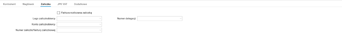 ·        Nagłówekzakładka zawiera numer faktury i jej opis, daty, informacje związane z walutą oraz płatnością.