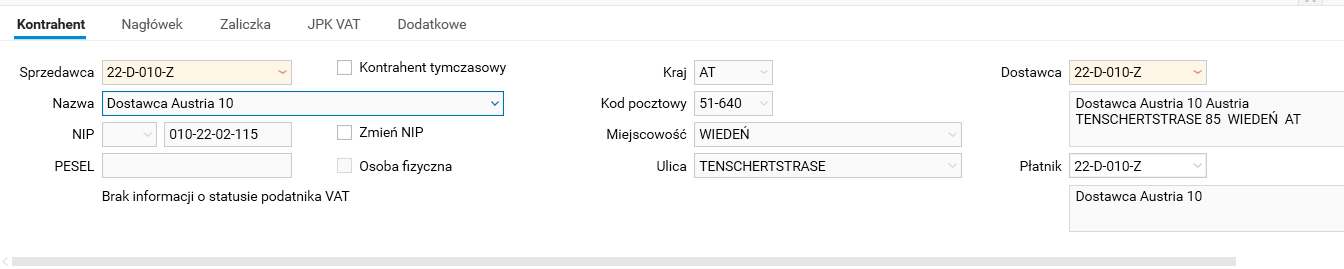 o   Informacja o statusie podatnika VAT – zamiast dotychczasowego znacznika Czynny podatnik VAT i daty sprawdzenia dodano pole opisowe zawierające informacje o statusie podatnika oraz datę ostatniego sprawdzenia statusu.