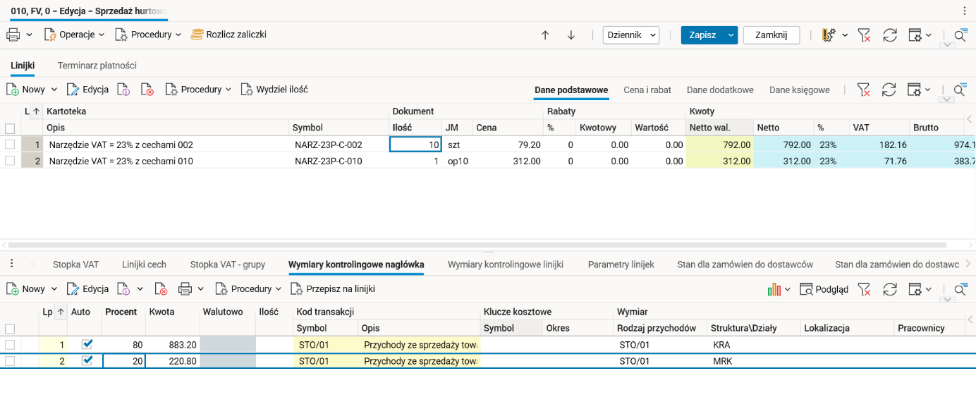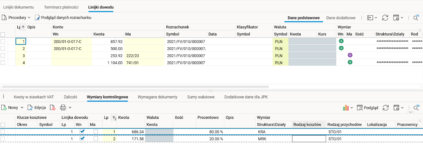 Po zaksięgowaniu dokumentu w module FK wymiary kontrolingowe zostaną uzupełnione zarówno na kontach przychodowych, jak i na linijkach z kontem rozrachunkowym.