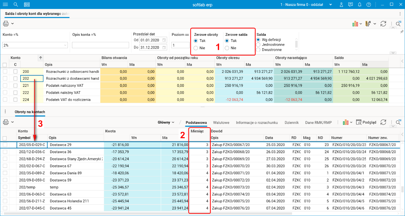Rys. Słownik Salda i obroty kont dla wybranego zakresu dat: nowe filtry (1), dodatkowa kolumna w szczególe (2) i nowe warunki połączenia słownika szczegółowego (3)