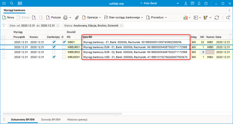 W słowniku Wyciągi bankowe dodano kolumnę Opis RD zawierającą opis rodzaju dowodu (czyli rodzaju wyciągu).