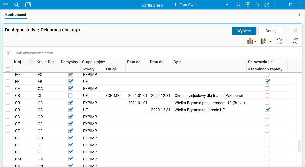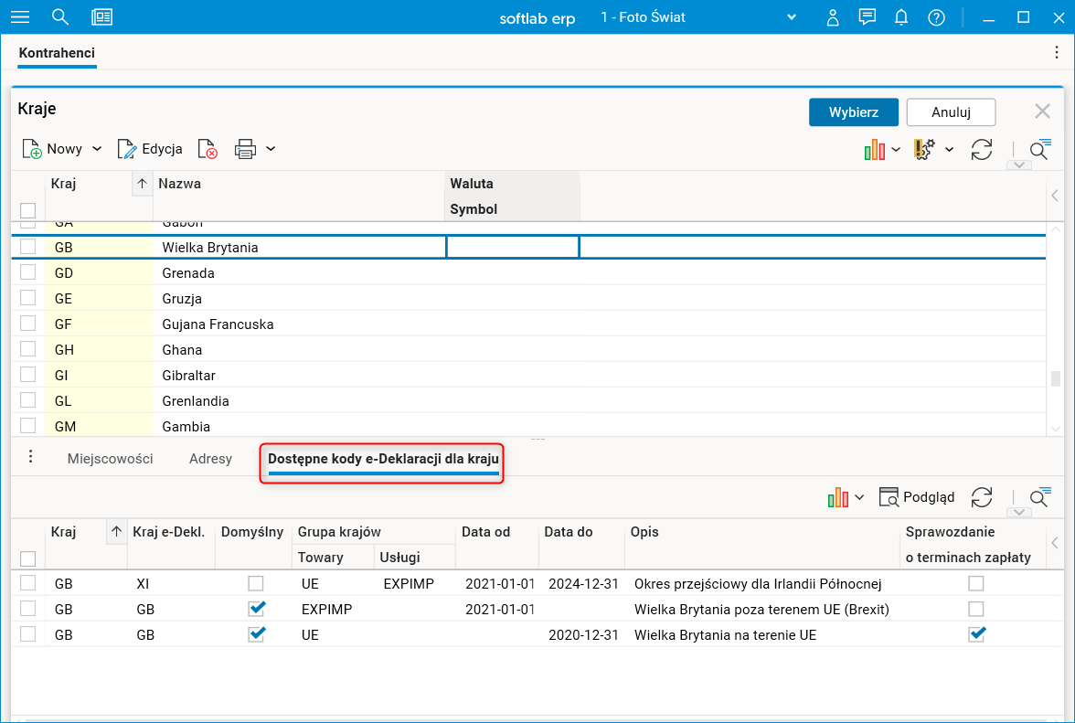 ·       Dostępne kody e-Deklaracji dla krajuw tym słowniku znajdują się powiązania kraju z kodami krajów dla e-Deklaracji oraz okres obowiązywania danego wpisu. Słownik jest dostępny jako szczegół w słowniku Kraje. Dla Wielkiej Brytanii w słowniku znajdują się trzy wpisy: