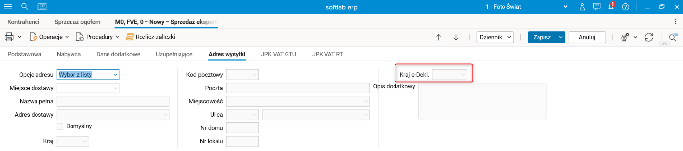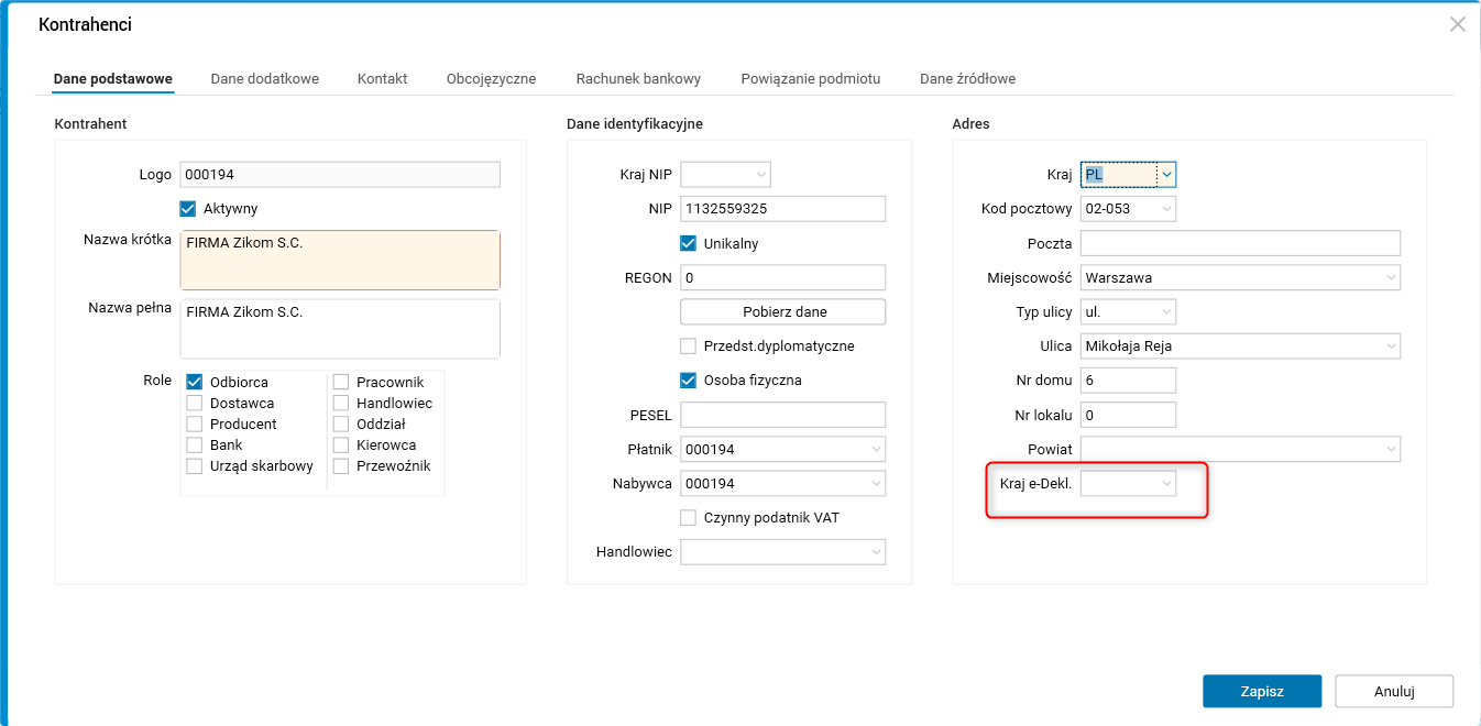 Pole Kraj e-Dekl. dostępne jest w oknie edycyjnym słownika Kontrahenci.