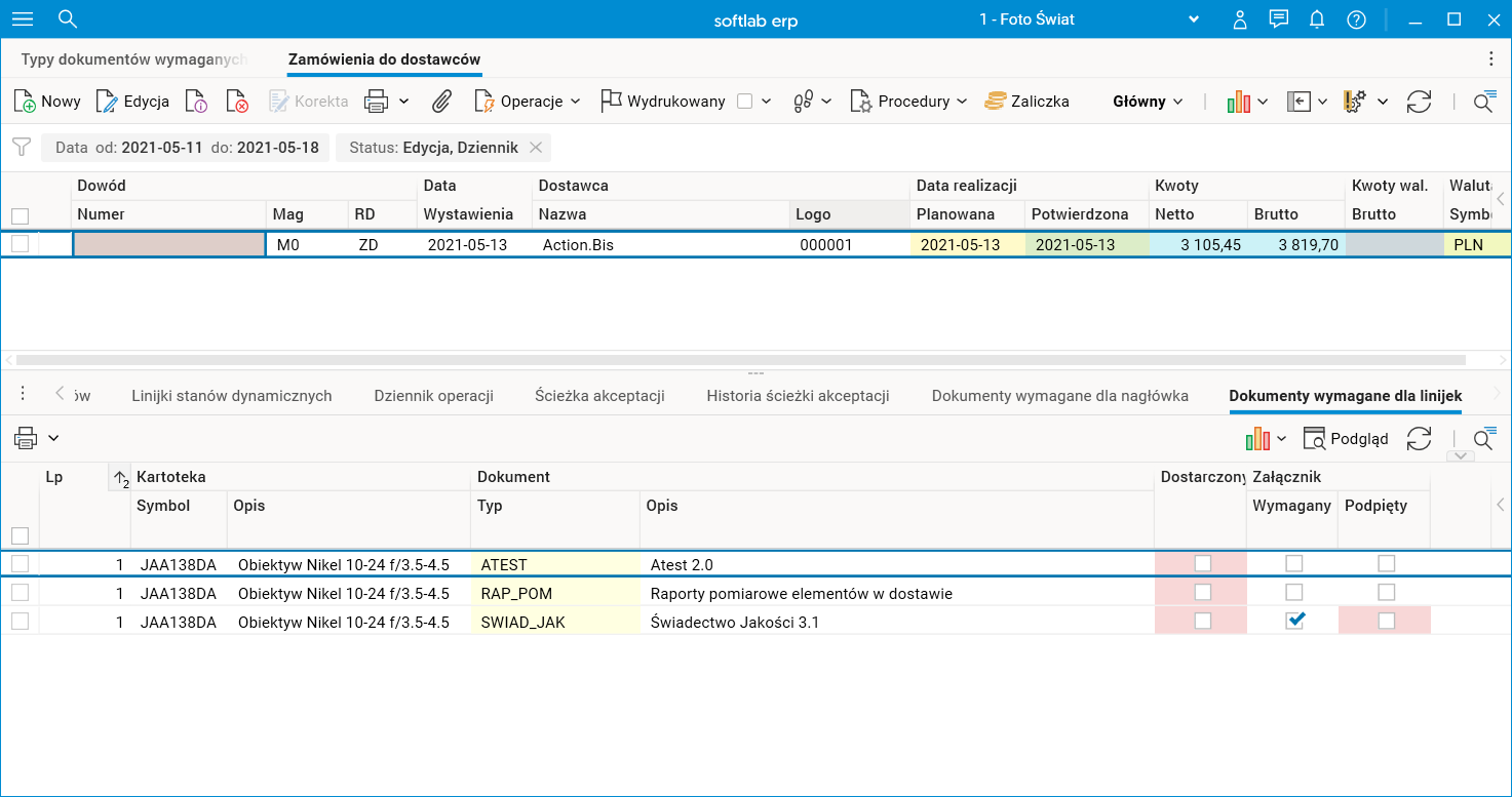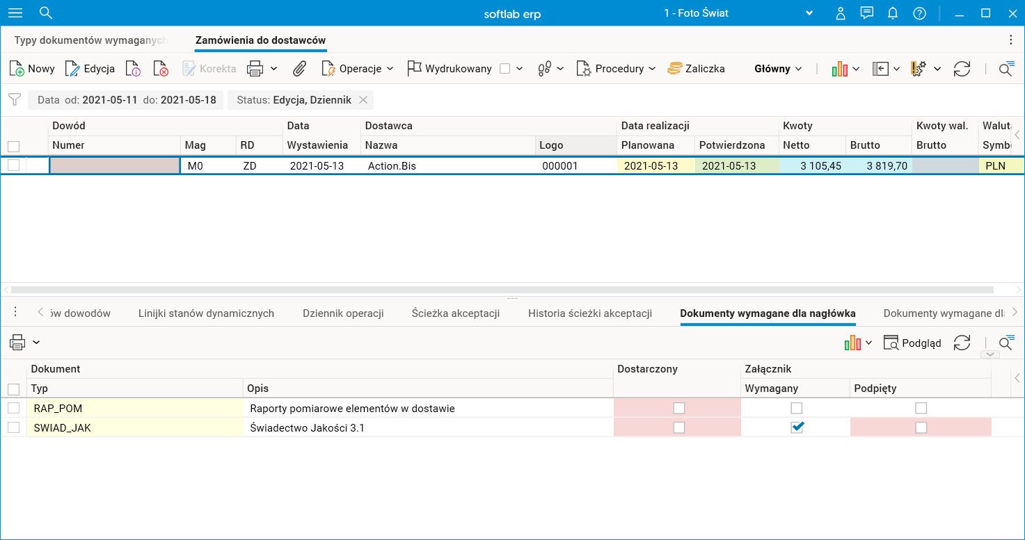 W wersji 2021.1 systemu wprowadzono możliwość wskazania dokumentów wymaganych przy przyjęciu dostawy. Funkcjonalność znajduje zastosowanie na przykład przy dostawach towarów, którym muszą towarzyszyć różne atesty, zgodności, świadectwa jakości, instrukcje itd.