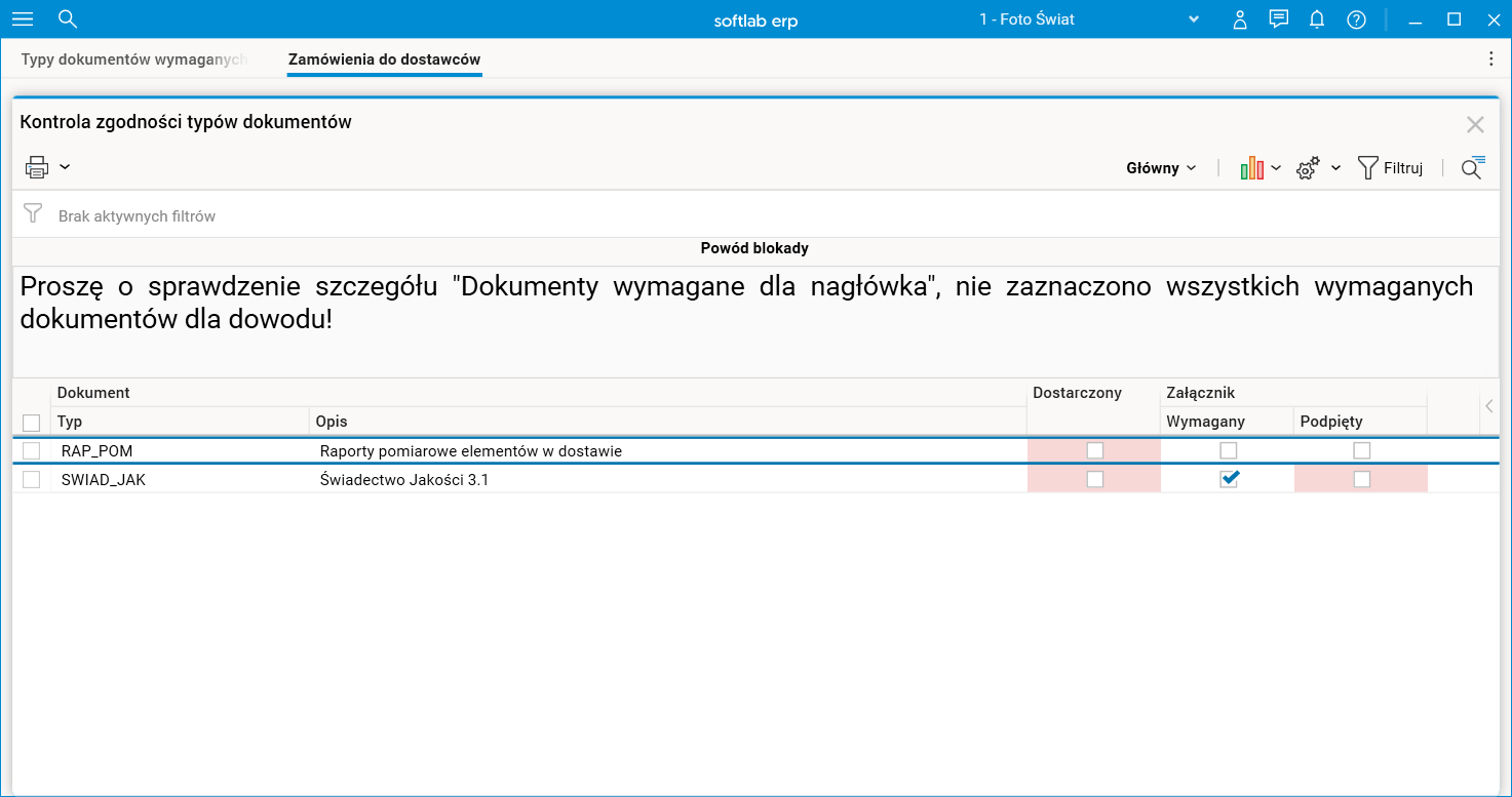 Obydwa szczegóły wyświetlają listę kontrolną dokumentów (załączników) wymaganych do zatwierdzenia zamówienia lub przyjęcia zewnętrznego. Pozwalają na odznaczenie na liście dokumentów, które zostały dostarczone. Dokumenty mogą być wymagane dla nagłówka dowodu (szczegół Dokumenty wymagane dla nagłówka) lub dla jego pozycji (szczegół Dokumenty wymagane dla linijek – lista dokumentów zależy wtedy od towaru znajdującego się na danej pozycji).