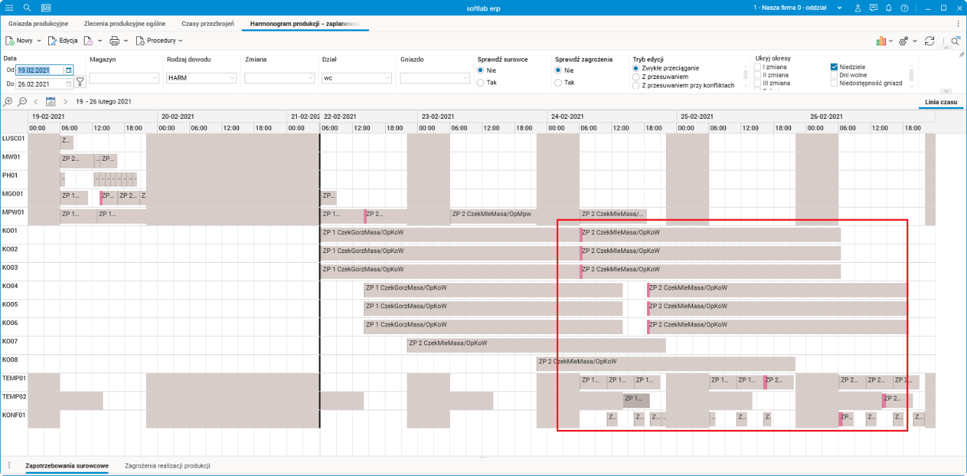 Na poniższym rysunku zaprezentowany jest zmodyfikowany widok przeglądarki harmonogramu produkcyjnego (słownik Harmonogram produkcji – zaplanowane zadania), na którym kolorem czerwonym wskazane są przezbrojenia.