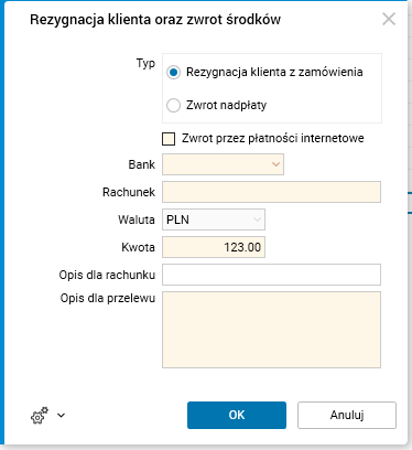 Rys. Okno parametrów procedury Rezygnacja klienta oraz zwrot środków, zwrot przelewem