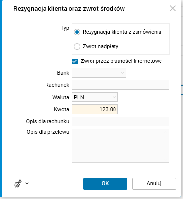 Rys. Okno parametrów procedury Rezygnacja klienta oraz zwrot środków, zwrot przez płatności internetowe