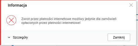 Rys. Komunikat błędu przy próbie zwrotu przez płatności internetowe zamówienia opłaconego w inny sposób