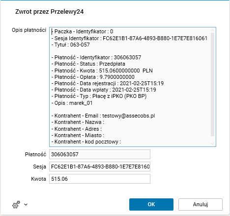 Rys. Okno parametrów procedury dla zwrotów przez Przelewy24