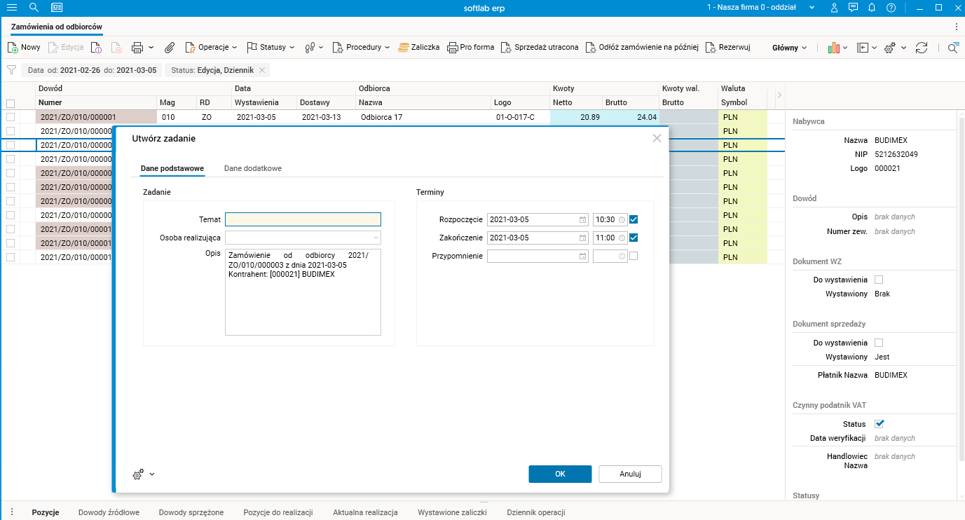 W systemie została utworzona nowa procedura Utwórz zadanie, która przy odpowiedniej konfiguracji systemu może być dostępna w dowolnym rejestrze logistycznym (np. dla zamówienia ZO) lub w słownikach Kartoteka materiałowa oraz Kontrahenci.