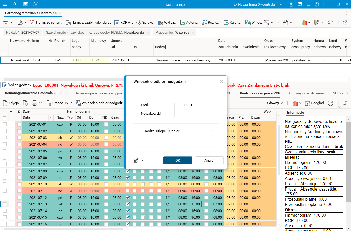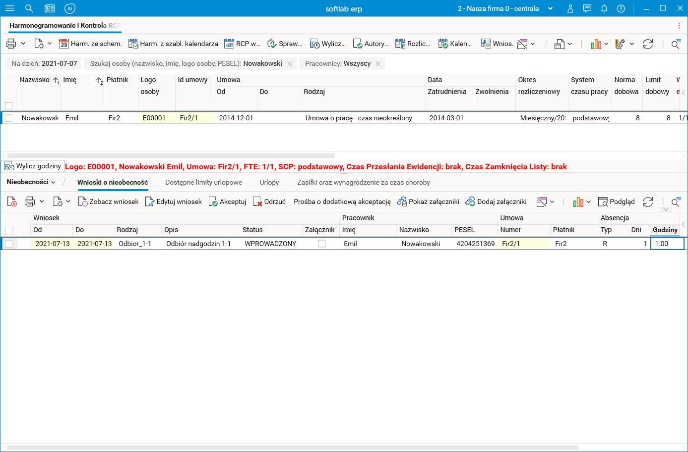 Pracownik w dniu odbioru (13.07) ma zarejestrowany rzeczywisty czas pracy mniejszy o 1 godzinę w stosunku do planu pracy (czyli ma zarejestrowaną 1-godzinną ucieczkę, tj. zamiast zgodnie z planem pracować od 8 do 16, pracował tylko do 15). Procedura Wniosek o odbiór nadgodzin rejestruje wniosek o odbiór 1 godziny.