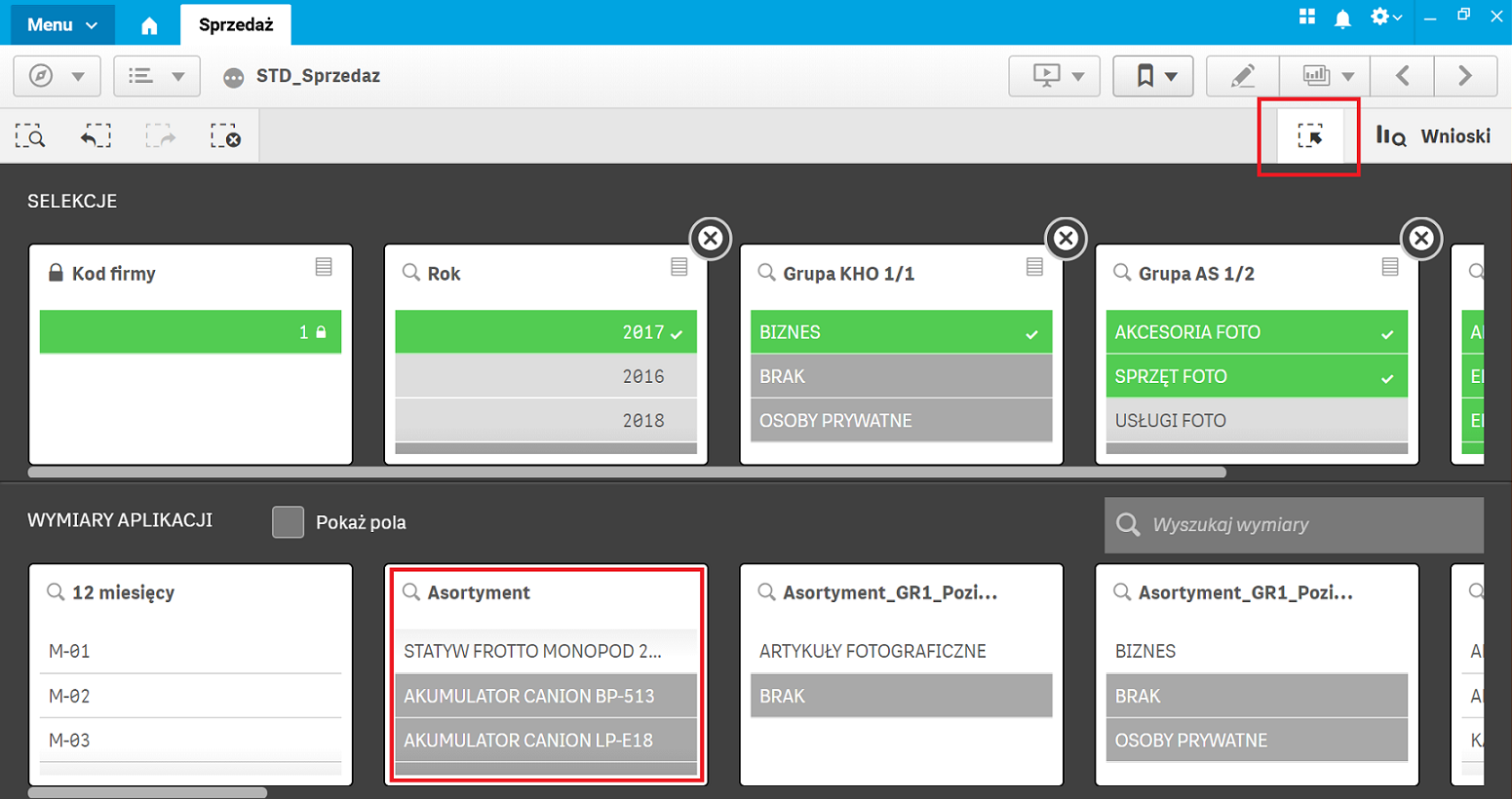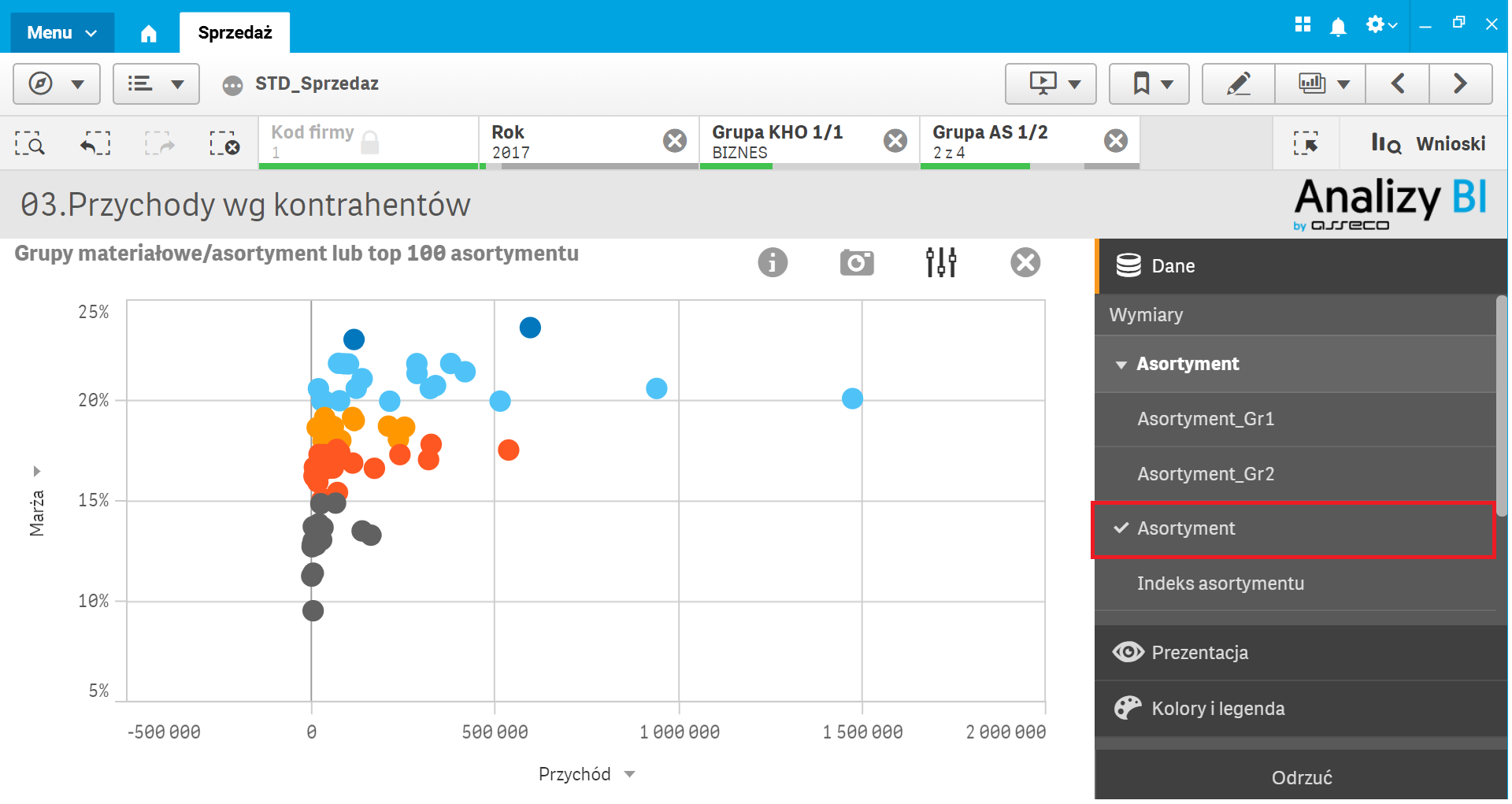 Celem biznesowym, który zarządzający przedsiębiorstwem chcą osiągnąć, jest zwiększenie dosprzedaży dla kontrahentów wysokomarżowych na asortymencie, którego do tej pory nie nabywali. Aby zidentyfikować takie towary, możemy skorzystać z narzędzia selekcji dostępnego w górnej części aplikacji. Po jego rozwinięciu mamy możliwość dynamicznego dodawania/usuwania filtrów dla danych (również za pomocą wyszukiwania inteligentnego, np. po poszczególnych pozycjach występujących w bazie danych). W rubryce Asortyment za pomocą listwy umieszczonej po prawej stronie możemy przesuwać filtr w dół, aż zaprezentowany zostanie asortyment oznaczony kolorem szarym – a więc asortyment, który nie był nabywany przez TOP klientów biznesowych w 2017 r.