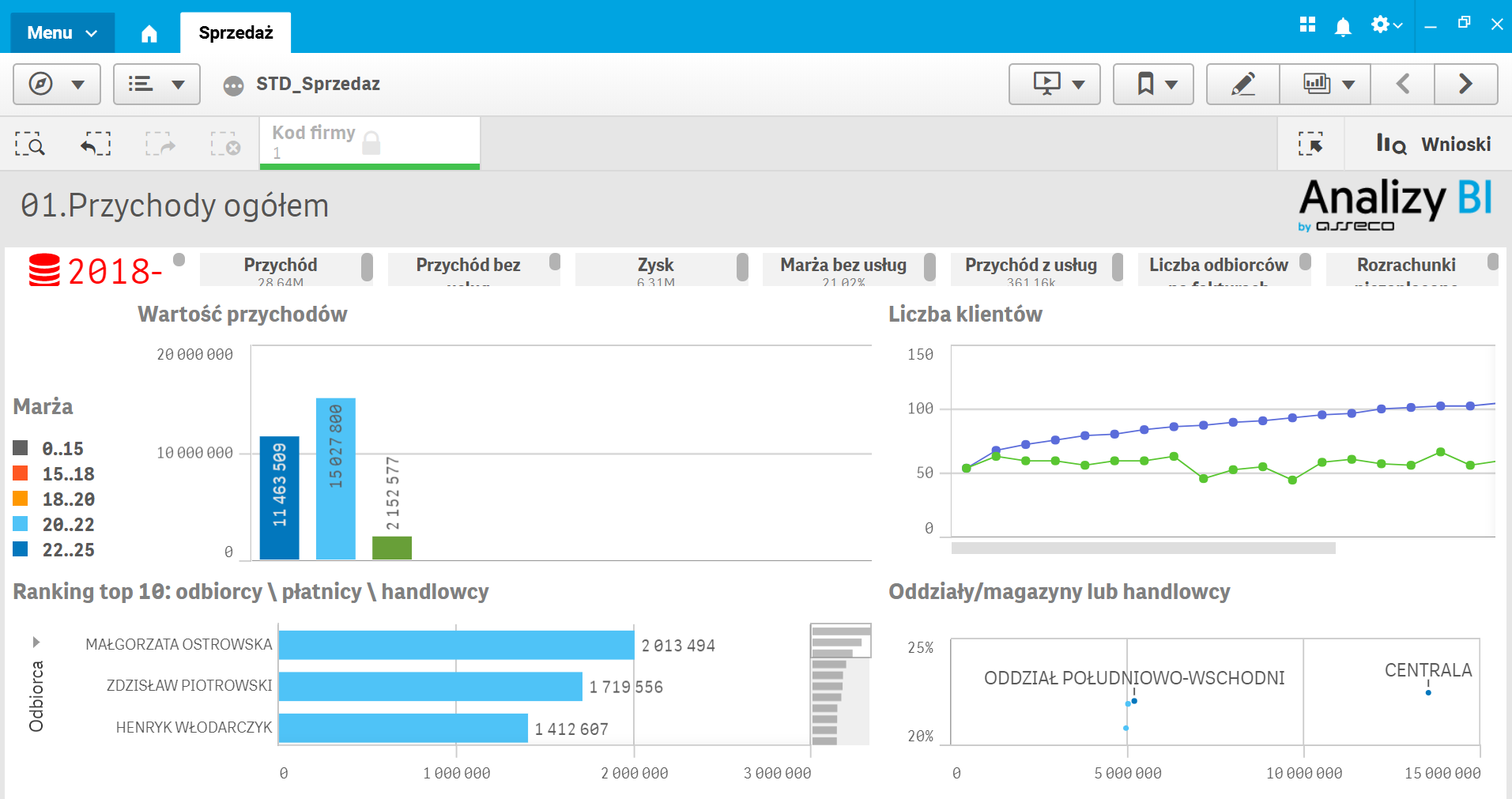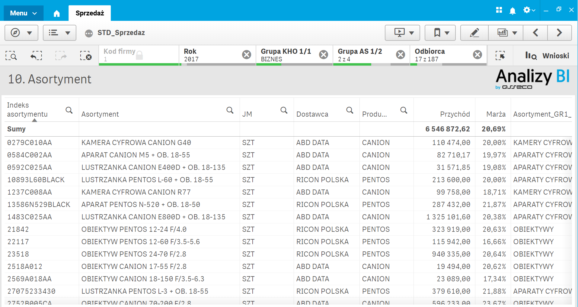 Mamy przygotować analizę, która w wynikach zwróci asortyment nabywany i nienabywany przez wysokomarżowych kontrahentów, celem dopasowania strategii sprzedażowej w przedsiębiorstwie. Aby to zrobić, w aplikacji Sprzedaż uruchamiamy arkusz analityczny 01. Przychody ogółem.