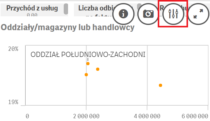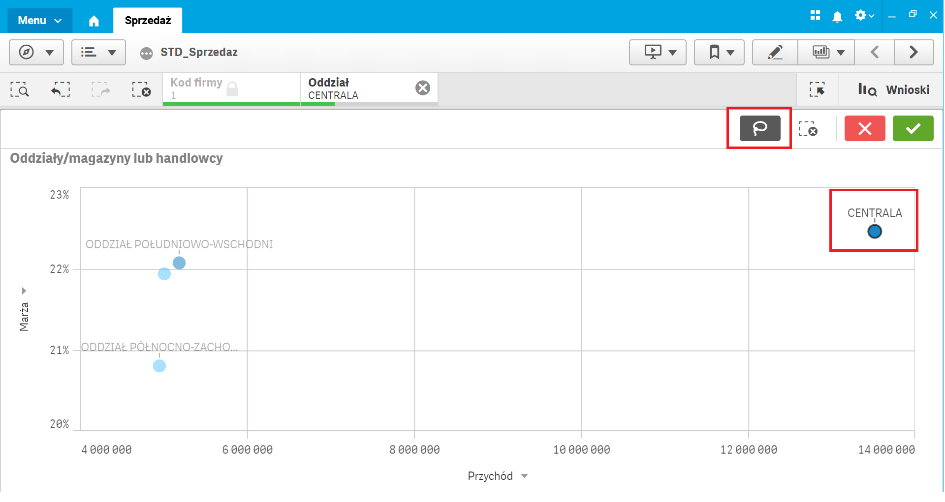 W kolejnym kroku za pomocą narzędzia lasso zawężamy analizowany zakres danych (drilldown danych), wybierając spośród oddziałów jeden: