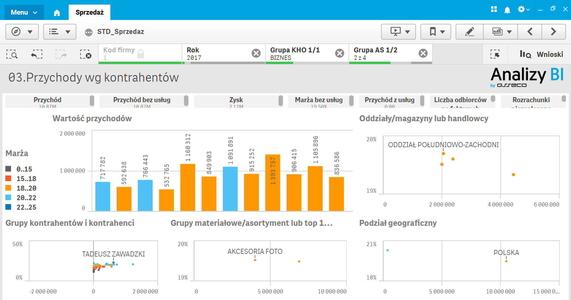 Po wykonaniu wymienionych selekcji przełączamy się do arkusza 03. Przychody wg kontrahentów, gdzie jest możliwość wybrania grup asortymentu oraz grup kontrahentów tak, aby móc jeszcze bardziej uszczegółowić zakres analizowanych danych i zbadać zależności występujące w węższym zbiorze danych.