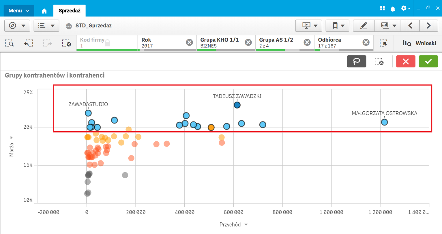 Dysponując takimi selekcjami należy także dobrać odpowiedni zakres klientów (w segmencie BIZNES). Wybieramy więc kontrahentów, w transakcjach z którymi uzyskiwana jest najlepsza marża – selekcję wykonujemy za pomocą narzędzia lasso:
