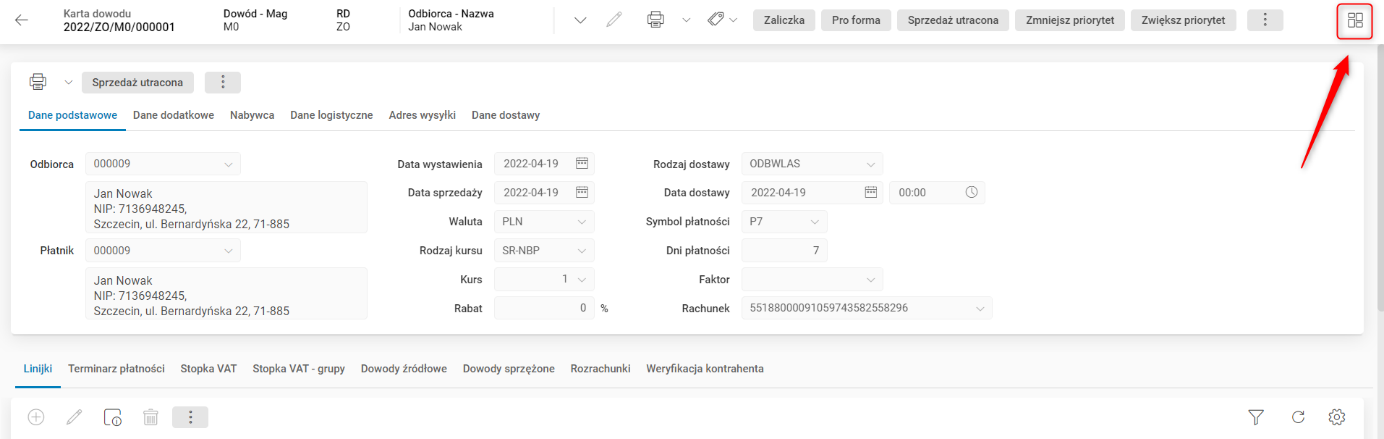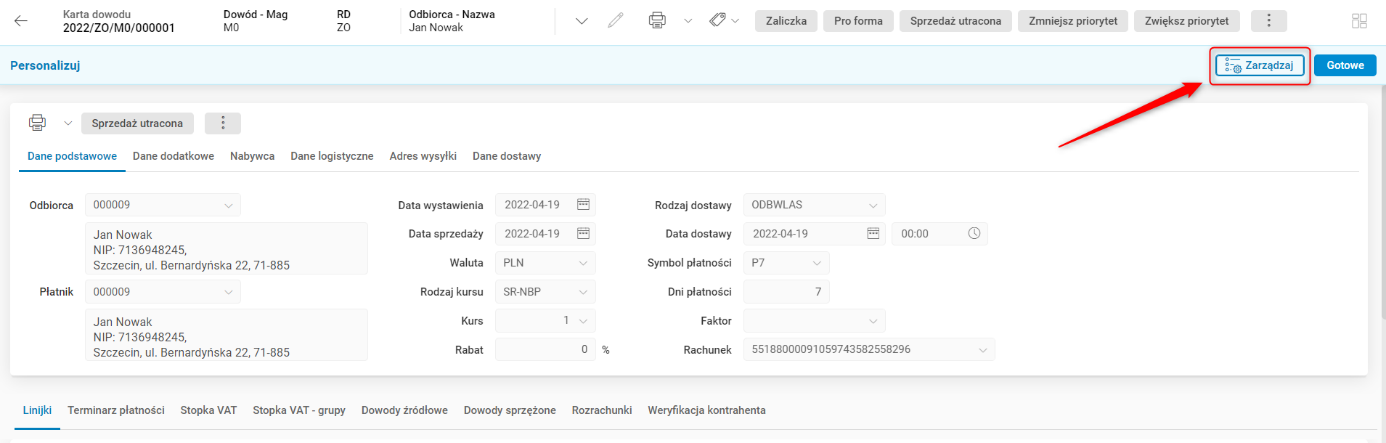 Przykładowo w słowniku Zamówienia do odbiorców po uruchomieniu szczegółów określonego dowodu (klikając w jego numer) wyszukujemy w prawym górnym rogu menu personalizacji.