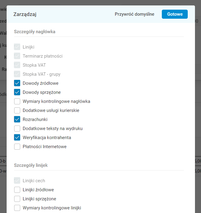 W oknie Zarządzaj możemy ukryć bądź wyświetlić zakładki, które są szczegółami nagłówka lub szczegółami linijek.