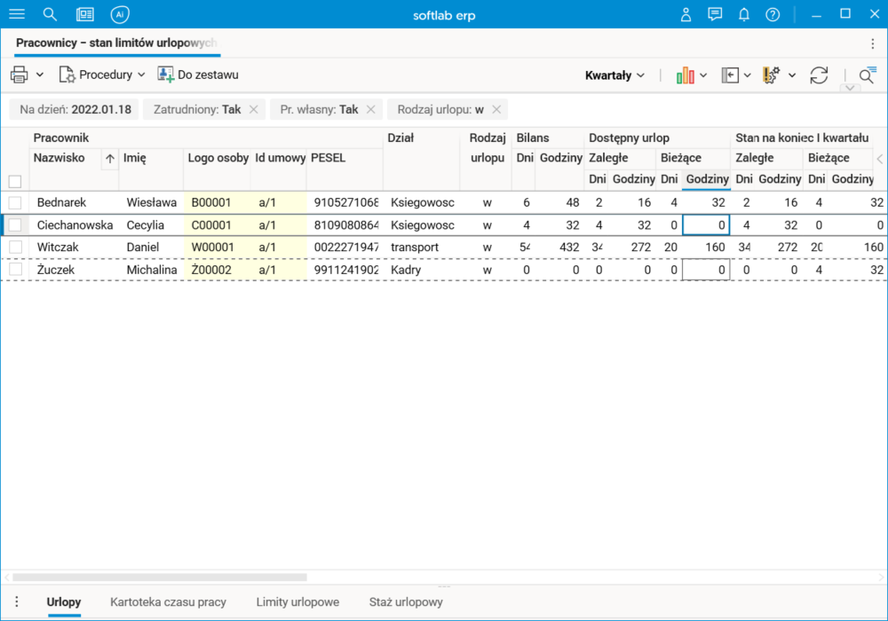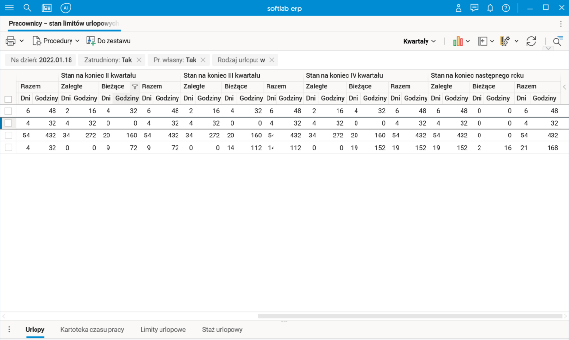 Umożliwiono analizę limitów urlopowych i stanu wykorzystania zaległych urlopów wypoczynkowych w podziale na poszczególne kwartały bieżącego roku. Dodatkowo udostępniono dane o stanie limitów urlopowych na koniec roku następnego.