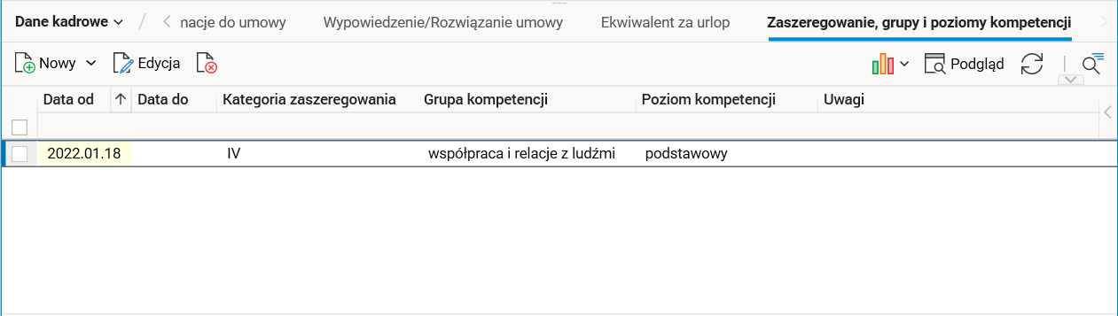 Słownik ten umożliwia wprowadzanie w jednym miejscu danych dotyczących pracownika w zakresie kategorii zaszeregowania, grupy kompetencji oraz poziomu kompetencji.