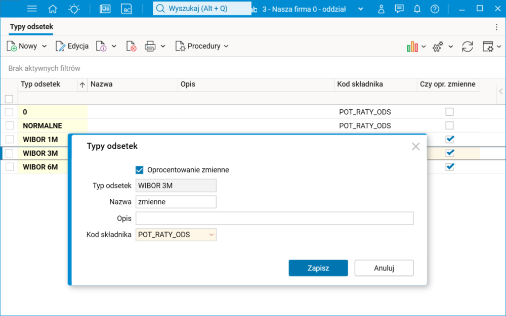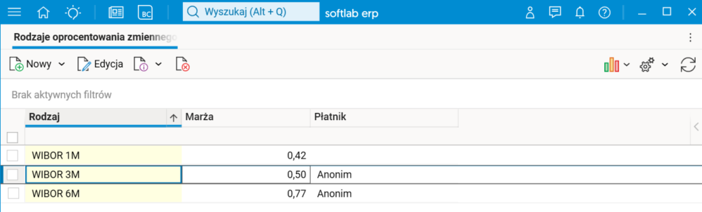W słowniku Rodzaje oprocentowania zmiennego definiujemy rodzaj oprocentowania zmiennego, nadając mu unikalną nazwę. Opcjonalnie możemy wskazać płatnika, dla którego rodzaj oprocentowania będzie stosowany – jeśli go nie wskażemy, to rodzaj oprocentowania będzie mógł być stosowany u wszystkich płatników. Możemy też określić marżę odsetkową, jaką płatnik będzie pobierać: oprocentowanie łączne pożyczki składać się będzie z określonego oprocentowania zmiennego i marży odsetkowej płatnika.