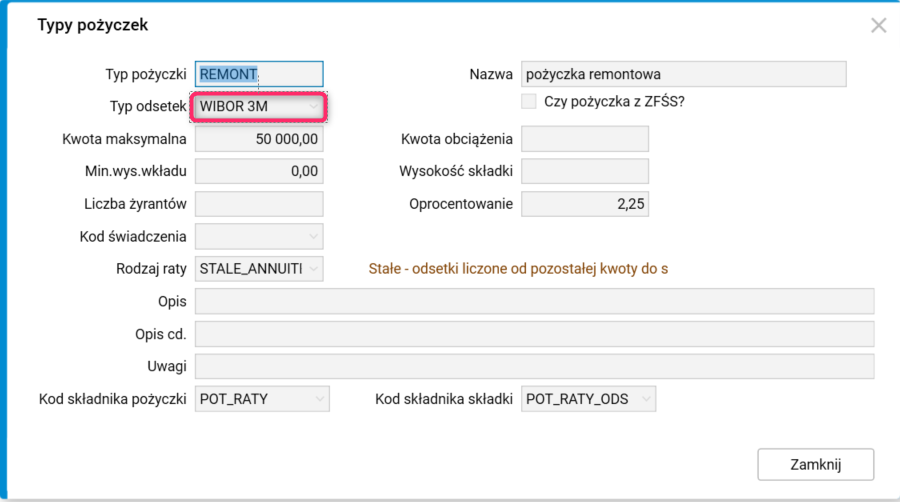 Dotychczas było możliwe rejestrowanie w systemie jedynie pożyczek ze stałym oprocentowaniem, na podstawie którego ustalana była wielkość odsetek, wysokość rat oraz harmonogram spłat.