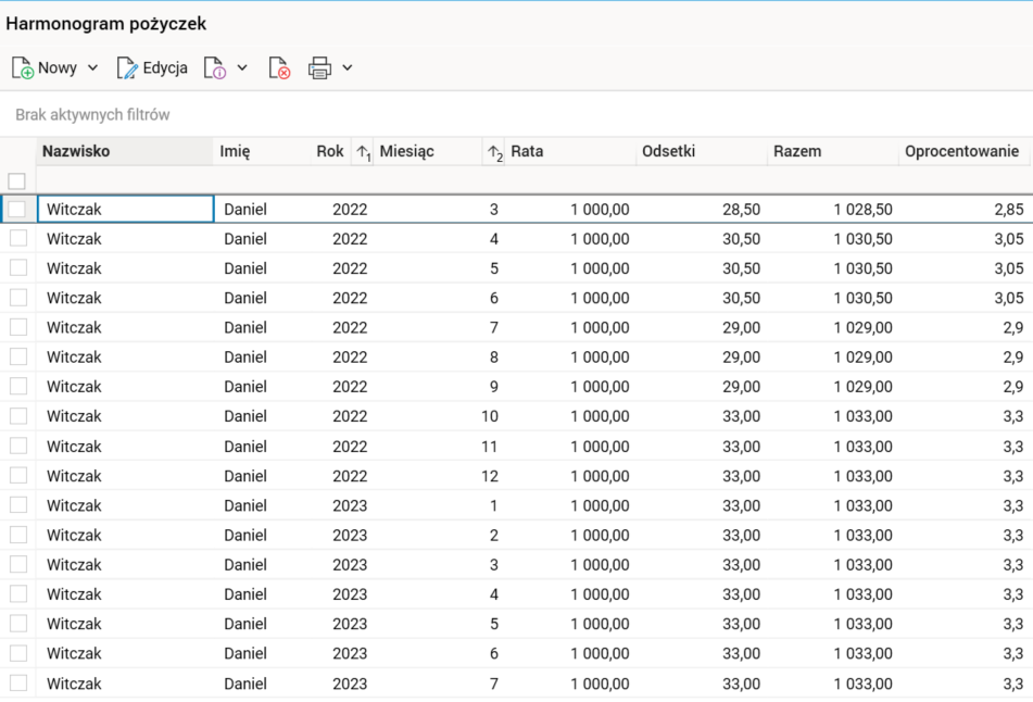 W harmonogramie spłaty pożyczki w słowniku Harmonogram pożyczek została dodana kolumna Oprocentowanie wskazująca, jakie oprocentowanie zostało wykorzystane do obliczenia raty w danym miesiącu, zgodnie z informacjami zawartymi w słowniku Oprocentowanie zmienne dla właściwego rodzaju oprocentowania zmiennego.