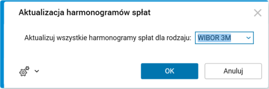 W słowniku Oprocentowanie zmienne dodano procedurę Aktualizacja harmonogramów spłat znak, która po uruchomieniu przeliczy oprocentowanie wszystkich pożyczek dla wybranego rodzaju oprocentowania (uwzględniając rodzaj oprocentowania zdefiniowany dla płatnika).