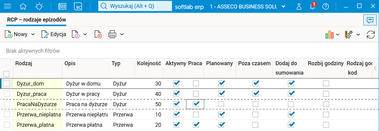 ·        Kolejność – unikalna kolejność epizodu w ramach typu (służy do ustalenia domyślnego epizodu dla przerwy / dyżuru – domyślny rodzaj epizodu to taki, który ma najniższą kolejność w ramach danego typu i w polach: Aktywny, Do sumy, Planowany ma ustawioną wartość 1).