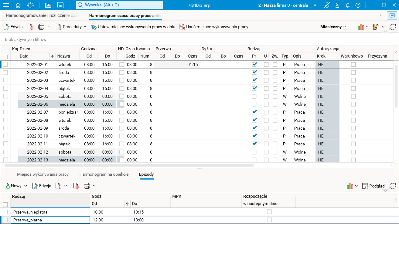 o   Epizody dostępnym jako szczegół słownika Harmonogram czasu pracy pracowników,