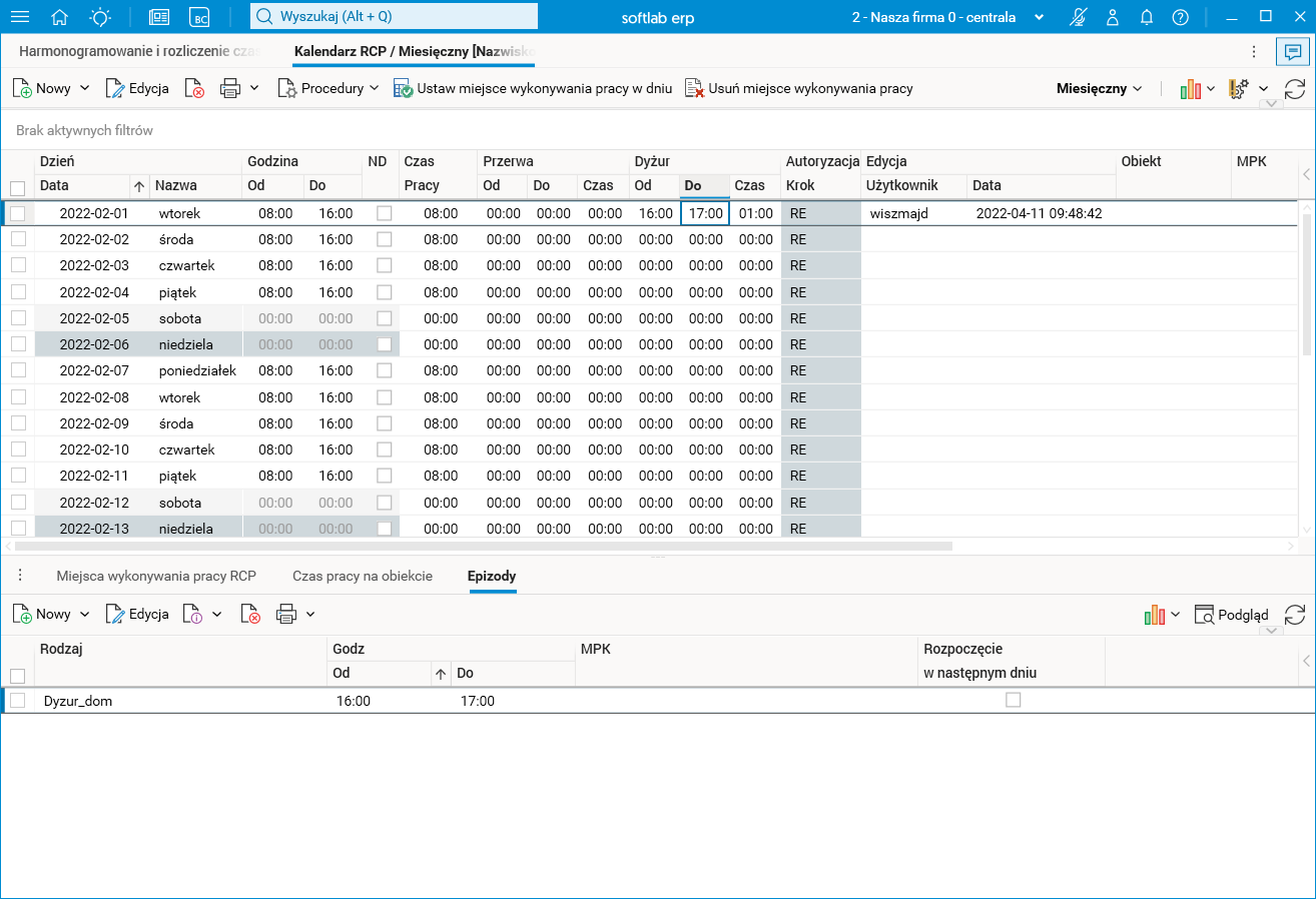 ·        W epizodach jest tylko jeden zapis w danym dniu o typie Dyżur zarejestrowany dla godzin dyżurów i jeden o typie Przerwa zarejestrowany dla godzin przerwy z rodzajem epizodu zgodnym z rodzajem, który został wskazany jako domyślny dla wskazanego typu i encji (harmonogram i kalendarz RCP).