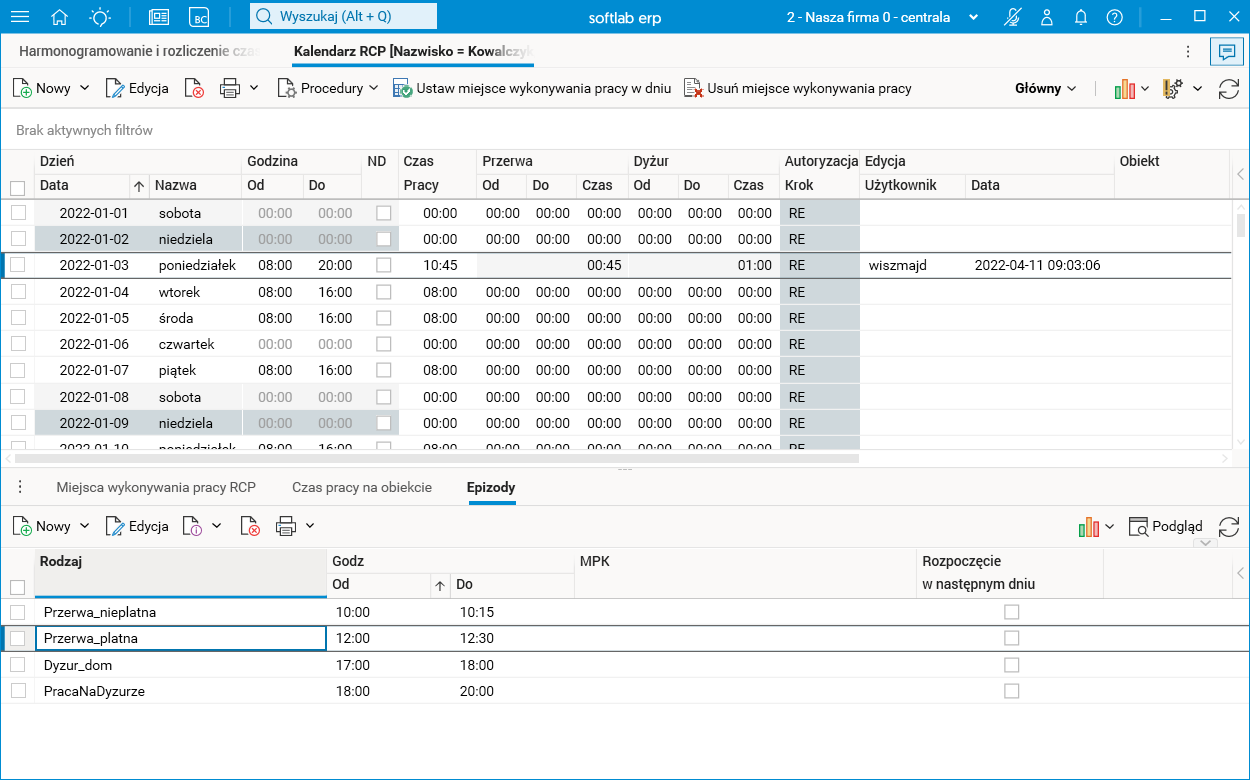 Dotychczas w module RCP rejestracja przerw lub dyżurów była ograniczona do jednego zapisu w danym dniu. Opisywana funkcjonalność umożliwia wprowadzanie wielu zapisów dotyczących przerw, dyżurów lub innych własnych typów epizodów, które mają być ewidencjonowane.