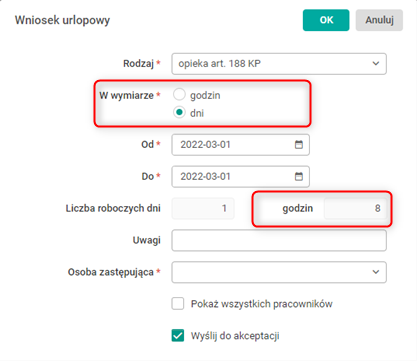 Jeżeli osoba po raz pierwszy w danym roku kalendarzowym składa wniosek o zwolnienie od pracy z tytułu opieki nad dzieckiem, wówczas w polu Rodzaj po wybraniu opieka art. 188 KP pojawi się pole W wymiarze z dwoma opcjami do wyboru: godzin oraz dni.