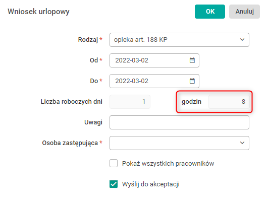 Rys. Układ formularza wniosku urlopowego o opiekę z art. 188 KP dla następnych wniosków przy wyborze w godzinach, pole godzin edytowalne