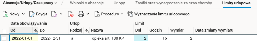 Rys. Wygenerowany automatycznie limit urlopowy dla rodzaju urlopu opieka art. 188 KP