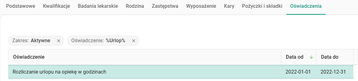 Jeżeli złożono wniosek o opiekę nad dzieckiem w godzinach, to zostanie wygenerowany limit urlopowy oraz oświadczenie pracownika.