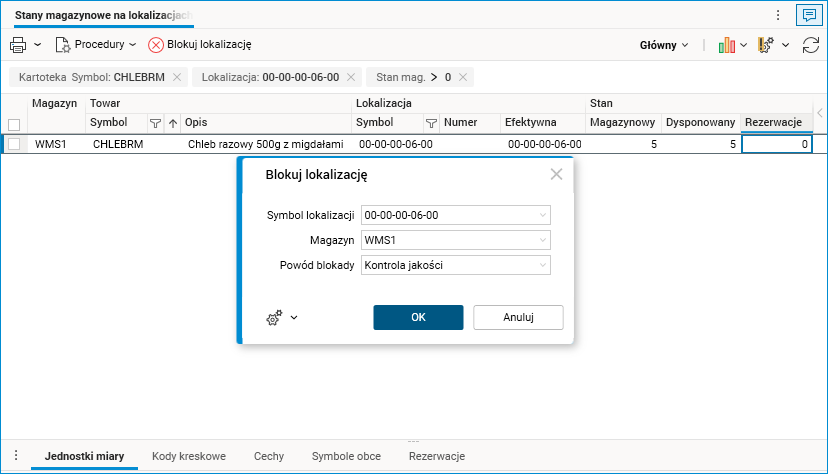 W module WMS w aplikacji desktopowej dodano możliwość zakładania rezerwacji kontroli jakości na całej lokalizacji, czyli na całym asortymencie znajdującym się na niej. Po założeniu rezerwacji możliwe będzie przeprowadzenie kontroli jakości towaru.