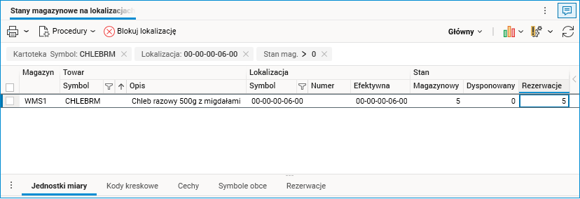 W ramach opisywanej zmiany w słowniku Stany magazynowe na lokalizacjach dodano procedurę Blokuj lokalizację, dzięki której można zablokować całą lokalizację, co powoduje nałożenie rezerwacji na wszystkie towary znajdujące się na niej.