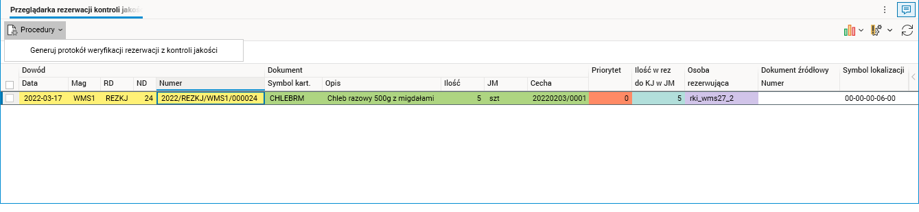 W wyniku działania procedury zostanie wystawiony dokument rezerwacji kontroli jakości REZKJ, który nakłada rezerwację na cały stan towaru znajdujący się na lokalizacji.