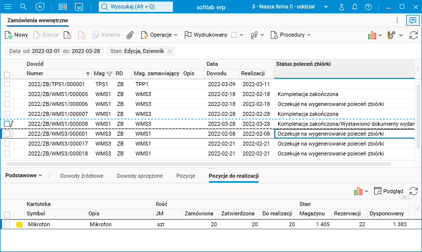 Weryfikację stopnia realizacji zbiórki poszczególnych towarów w ramach wybranego zamówienia umożliwia szczegół Pozycje do realizacji, dostępny w słowniku Zamówienia wewnętrzne . Wyświetla on wszystkie pozycje znajdujące się na dokumencie ZB, a dla każdej z nich prezentowane są m.in. aktualne stany magazynowe, ilości, jakie zostały zamówione oraz ilości skompletowane przez magazyniera.